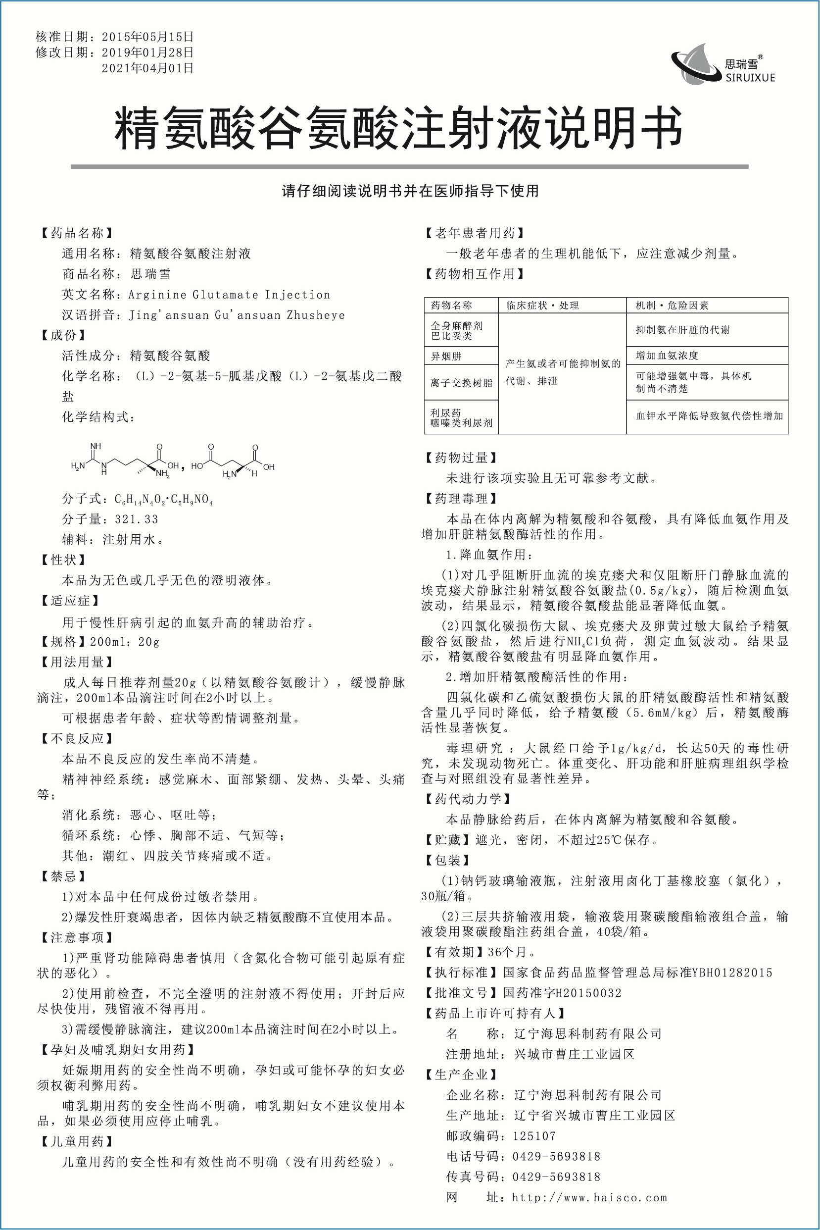 【用法用量】成人每日推荐剂量2����� �������Ƴ����������� �������Ƴ�������0g(以精氨酸谷氨酸计),缓慢静脉滴注。����� �������Ƴ������������ �������Ƴ������������ �������Ƴ�������200ml本品滴注时间在2小时以上����� �������Ƴ������������ �������Ƴ������。可根据患者年龄、症状等酌����� �������Ƴ����������� �������Ƴ�������情调整剂量。